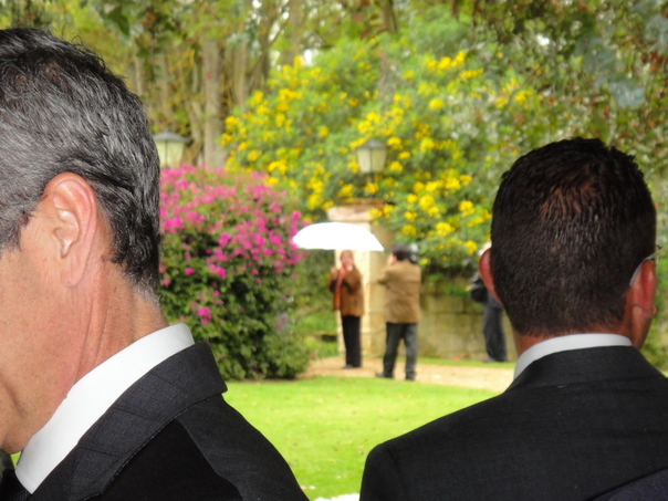 This photo shows two men standing in the background near colorful bushes, and two men in the foreground that are not fully visible. |