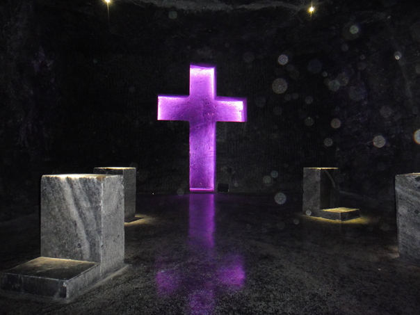 This is a room of marble floors, stone chairs and a cross on the wall illuminated with purple light. |