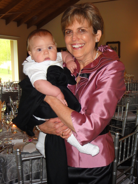 A smiling woman in a shiny pink jacket holding a baby in a black dress. |