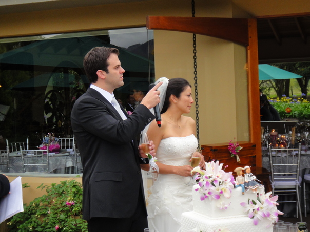 The people in this photo look like they just got married and are about to say a few words. |
