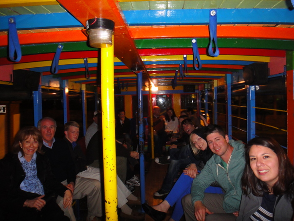 A large group of people sit in a colorful bus smiling. |