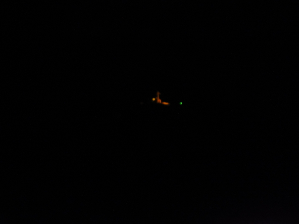 The picture is dark but there are multi-colored lights shining through. |