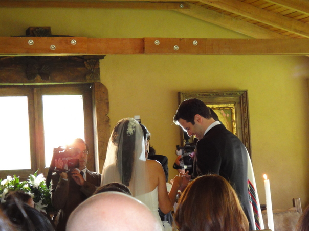 A photographer filming a bride in groom during their ceremony in a rustic church with a wooden beam filled with shiny bolts over their heads. |