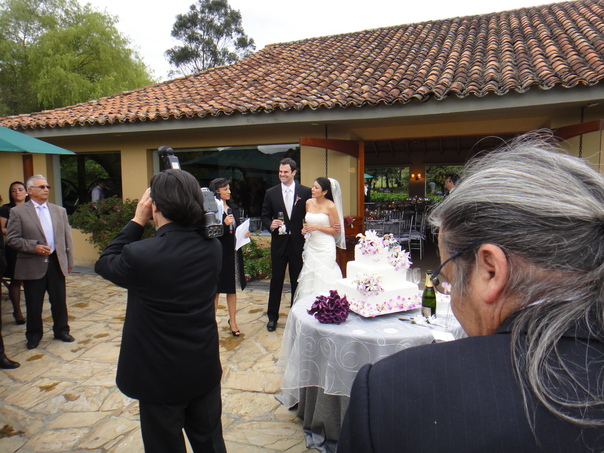 Bride and groom standing next to their cake out side and to the left is a camera man filming guests. |