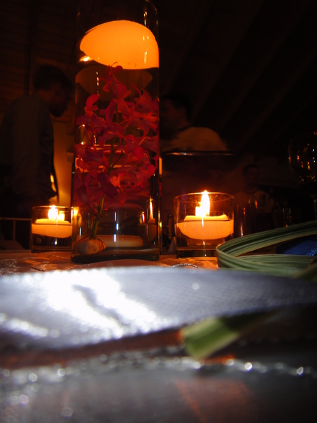 The centerpiece on the table consists of a vase filled water, flower petals and a lit candle. |