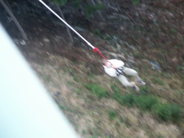 A man hangs from a bungee cord in a harness rock climbers wear around the pelvis.
