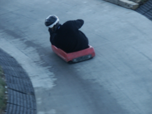 person sitting in red wooden box with wheels on the gray road