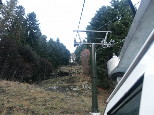 Picture from a tram car going up the side of a mountain.