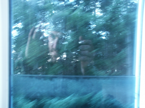 This looks like a picture of a man trying to break in someone's home or someone just playing with someone. The picture looks so blurry who can tell.