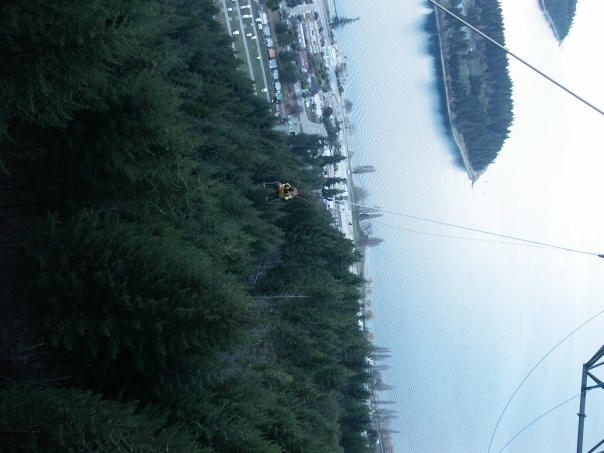 it is hard to determine exactly what that person is hanging from, but it is definately a person hanging from some sort of wire suspended above a very treed site with a waterway and small island in the background.