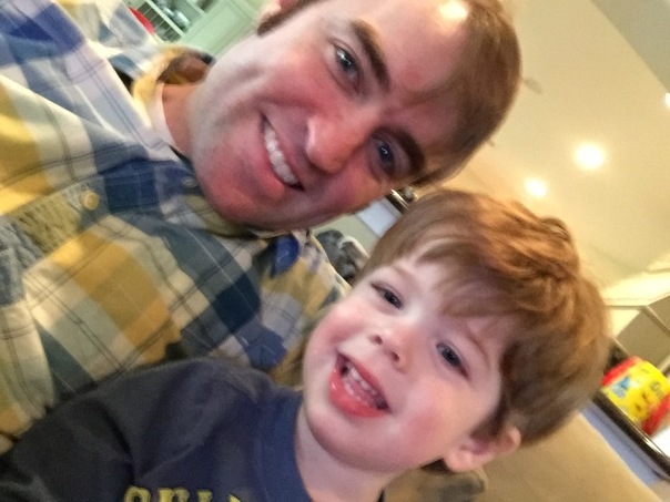 A man in plaid and a little boy smile for the camera.