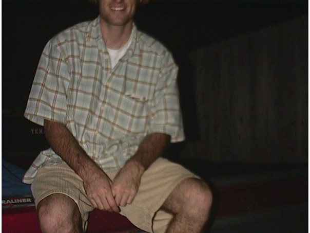 A man is seated on a red chair wearing khaki shorts and a plaid shirt, half of his head is cut off in the photo.