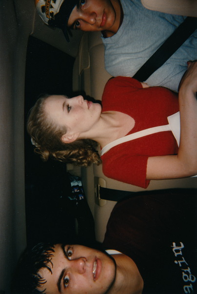 A woman in a red shirt is in the middle of two guys |