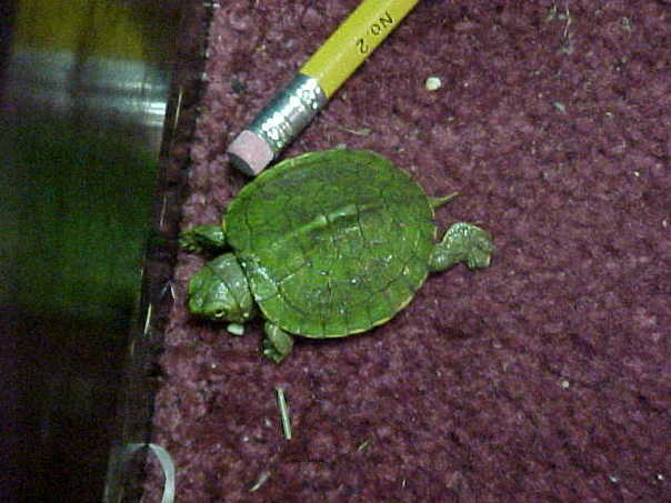 The infantile turtle was so small that he got lost in the office supplies on her floor.