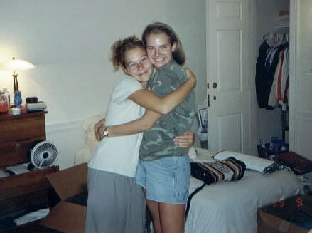 Two young women wearing summer clothes are happily hugging each other in what appears to be a slightly messy bedroom with white walls.
