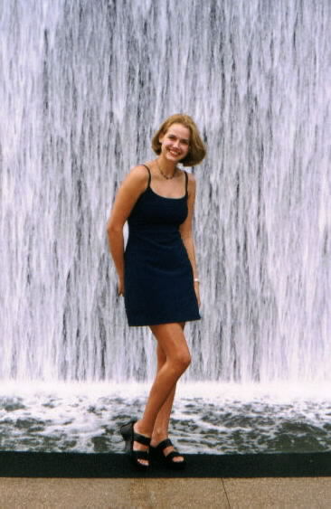 She slumped over slightly when having her photograph taken in front of the calming waterfall.