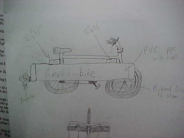 A dark, pencil drawing of an "Amphibi-bike" is depicted on a white piece of paper.