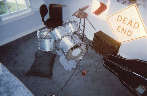 In a room some musicla articles are spread here and there. Drumps gitar box etc.