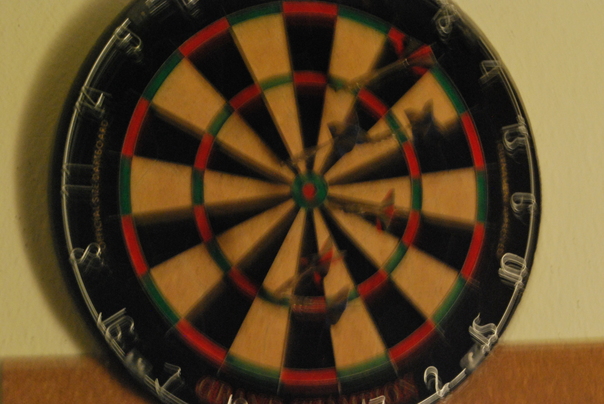 The round dart board is black, red, green, and white with darts on it.
