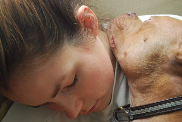 A cute young girl and her brown dog are taking a nap together.