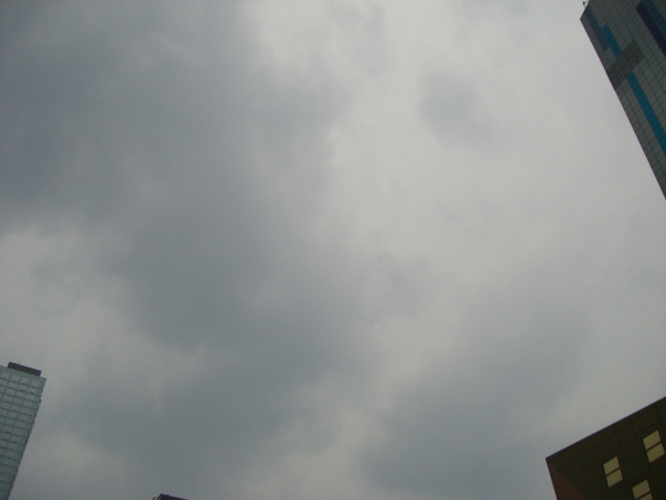 Picture of cloudy sky with tall buildings peeking around the edges of photograph.