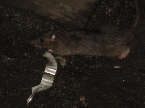 A brown rat is on a wet black ground near a silver strip of metal.
