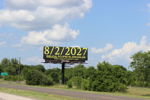 This is a billboard that says "8/2/2027 Biblical Eclipse in Jerusalem www.august2nd2027.com."