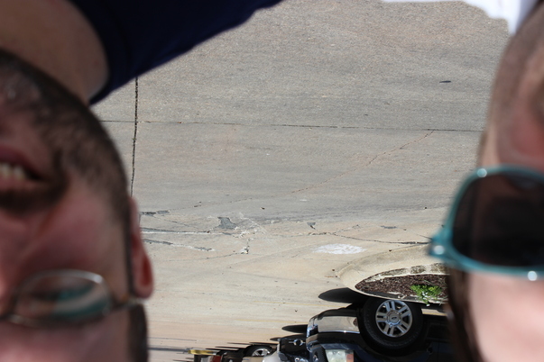 Two young white men with glasses and sunglasses standing in a parking lot.