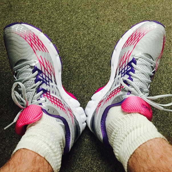 A pair of Caucasian human feet wearing white tube socks and white, gray, purple, and pink tennis shoes on a green carpet.