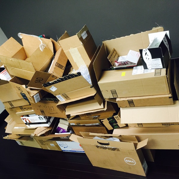 Opened boxes stacked against a wall waiting to be recycled or re-purposed.