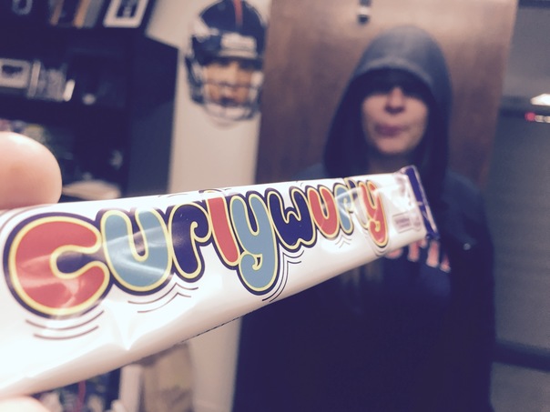 Someone is holding a bar of some sorts labeled curlywurly as another person playfully looks on.