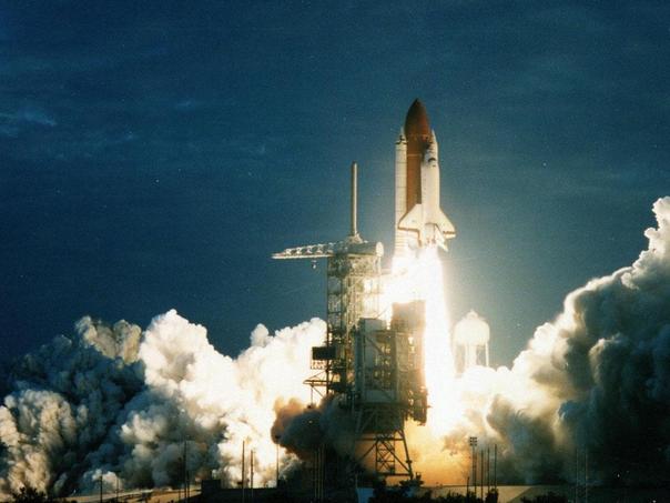 A white spaceship is launching into the sky leaving behind billowing clouds of smoke.