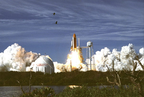 Birds fly by as a space shuttle achieves lift off from a rural setting.