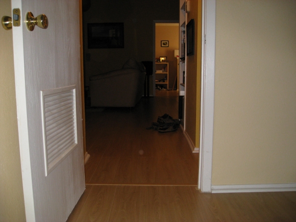 inside of a house, a room with a leather chair and hardwood flooring is visible through a doorway |