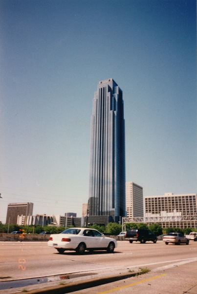 This picture depicts a white mid-size car on a roadway in the foreground with a gray skyscraper and several other large business buildings in the background.