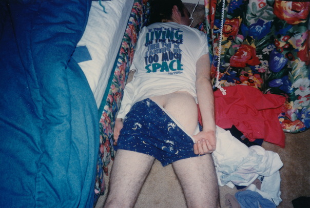 This is a picture of a drunk man laying on a messy floor with his pants down.