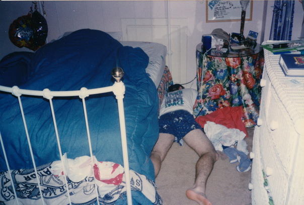 A man in shorts and a t-shirt laying face down beside a bed in a messy room.