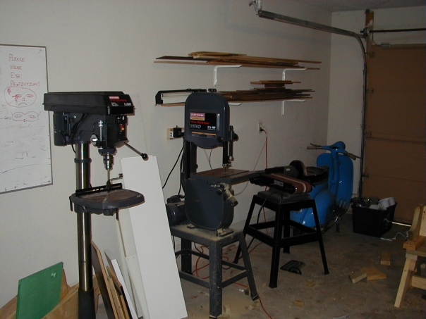 The shop is full of tools such as skil saw and there is wood on the floor.