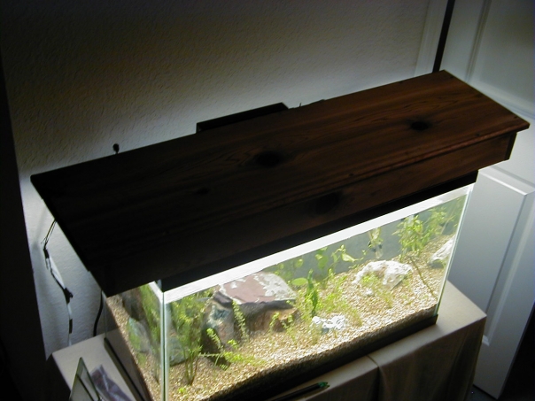 A beautiful fish tank is placed on the table inside the house.