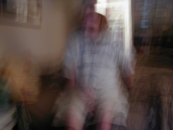 blurry person dressed in white, is sitting on a bed