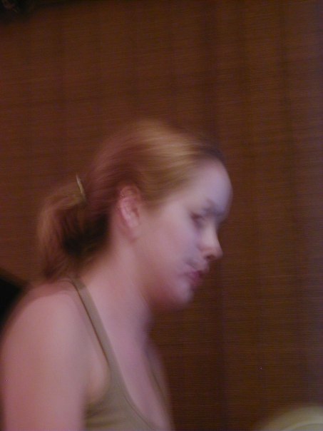 blurry picture of a woman in a green tank top standing in front of a wooden wall