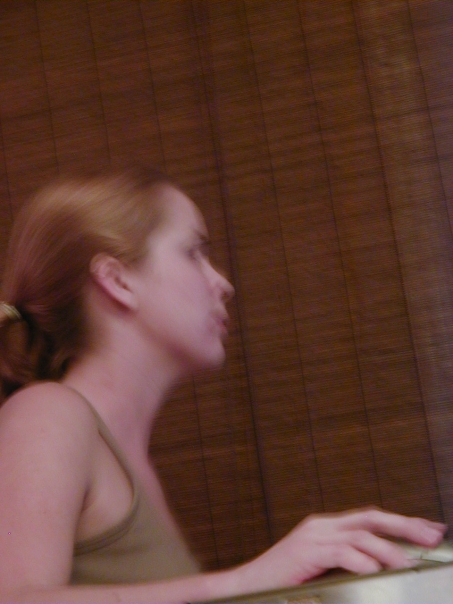 A blurry picture of a young blonde woman wearing a beige tank top standing in front of a bamboo curtain.