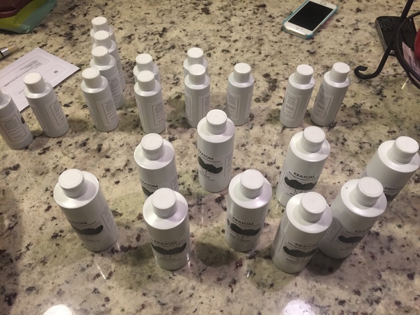 Products in white bottles on a stone counter top seen from above.