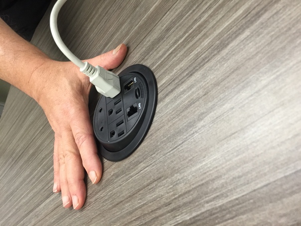 A man putting a plug on the switch board kept on the table