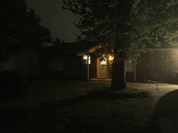 A very calm and peaceful evening at a well lit residence.