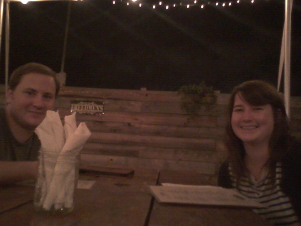 A man and a woman sitting at simple wooden table pause from viewing the menu to smile.
