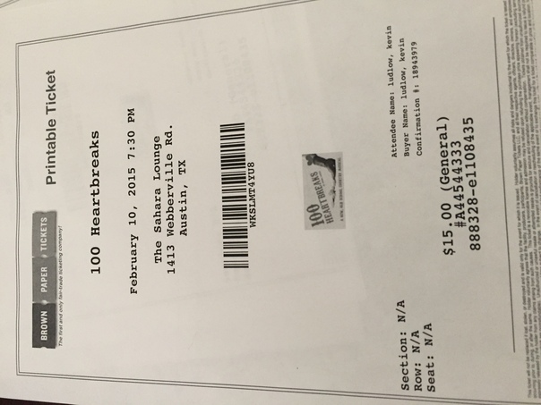 Ticket confirmation receipt for 100 Heartbreaks on February 10th, 2015 at 7:30 pm at The Sahara Lounge