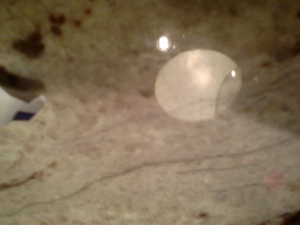 The brown, grey, tan and black flecked marble counter reflects the light.