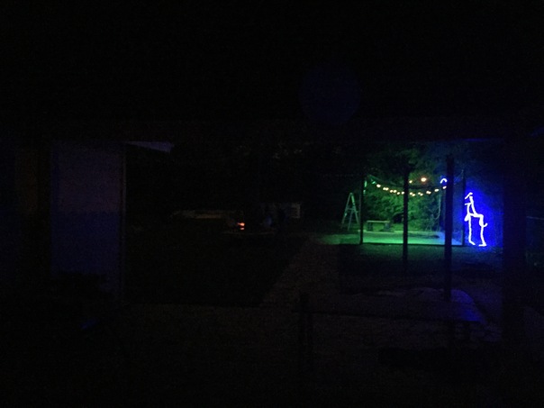 The photo was dim and dark and seemed to be focused on a neon light outside the building.