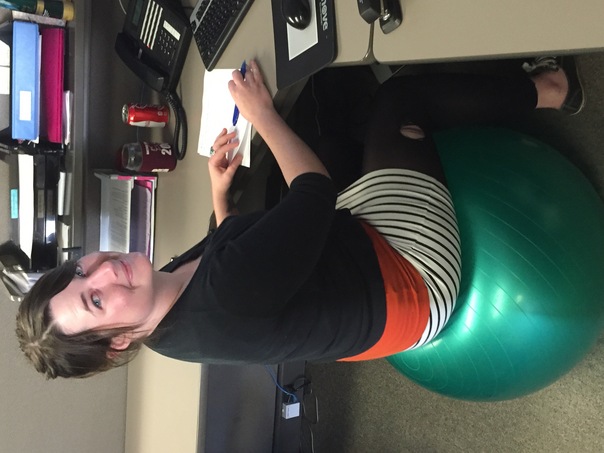 A dark-haired smiling woman sitting at a desk on a green ball.